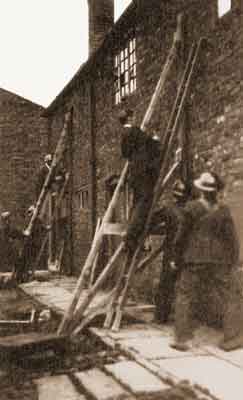 The ARP practising at the hamlet of Beat Bank in 1940.Part of the ‘Top End’ Works of Wilde & Booth Ltd on Wilton St was used as the Denton Central Air Raid Precautions (ARP) Report Centre but in 1941 the name was changed to the ‘Civil Defence Service’. The Deputy Town Clerk of Denton, Fred Hamer, was in charge of the ARP Report Centre. The ARP had an equipment store in Denton Council’s Board Yard off Victoria Street. This included, torches, stretchers, ladders, ropes, timber props, lifting equipment and vehicles. The yard was shared with the Auxiliary Fire Service (AFS) and St John Ambulance.