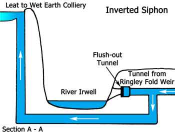 The tunnel arrived at the river by Giant's Seat where a vertical shaft was sunk to a depth below that of the bed of the river Irwell, as well as one more flush-out tunnel to the river bank. Opposite this shaft, on the south bank of the river, a second vertical shaft was sunk to the same level as the first tunnel. The two vertical shafts were then connected together by driving a 220-foot long horizontal tunnel below the bed of the river. In this way, the two vertical shafts and the horizontal tunnel formed an inverted siphon.